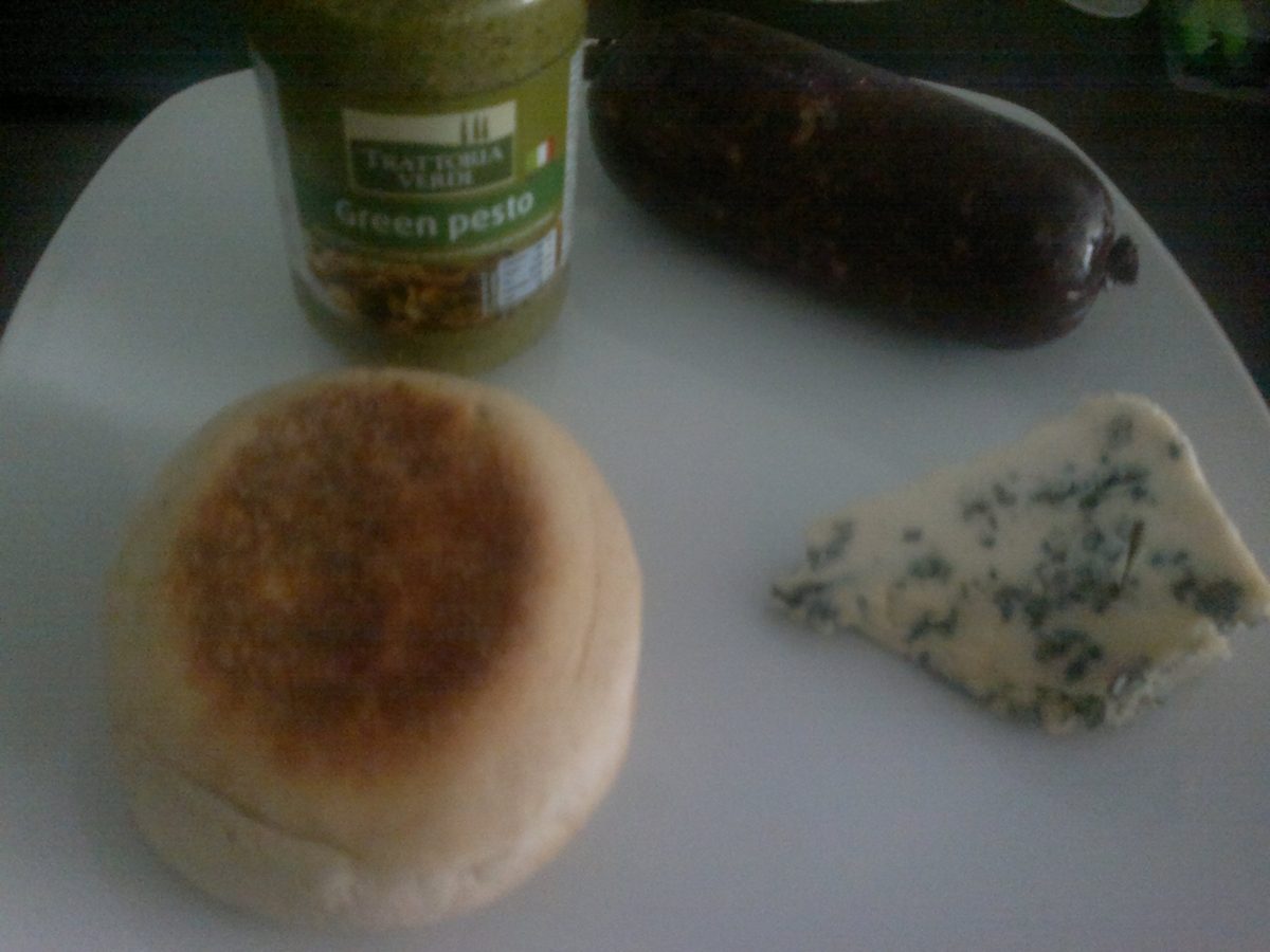 Toasted English muffin; blue cheese spread on one side, green pesto on the other and a filling of black pudding. Yes, two of the countries most hated foods.